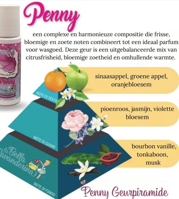 Laat je verleiden door de harmonieuze combinatie van citrus, bloemen en warme tonen. Penny opent met een levendige explosie van sinaasappel en granaatappel, gevolgd door een romantisch bloemig hart van pioenroos en jasmijn. De diepere tonen van Bourbon-vanille, tonkaboon en muskus geven een luxueuze en langdurige geur aan je kleding en textiel.